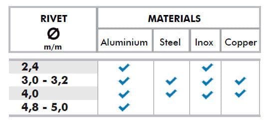 Applies Aluminium rivets from 2.4mm to 5.0mm (please view table for other material rivets)